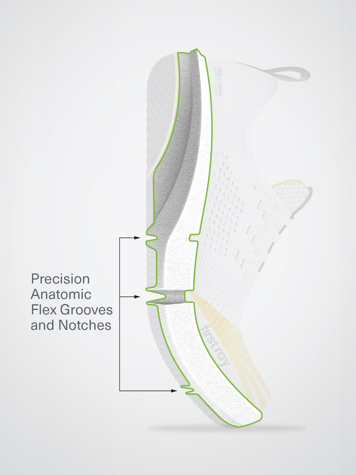 The Holloway features five core innovations that work together to awaken the natural mechanics of your feet.