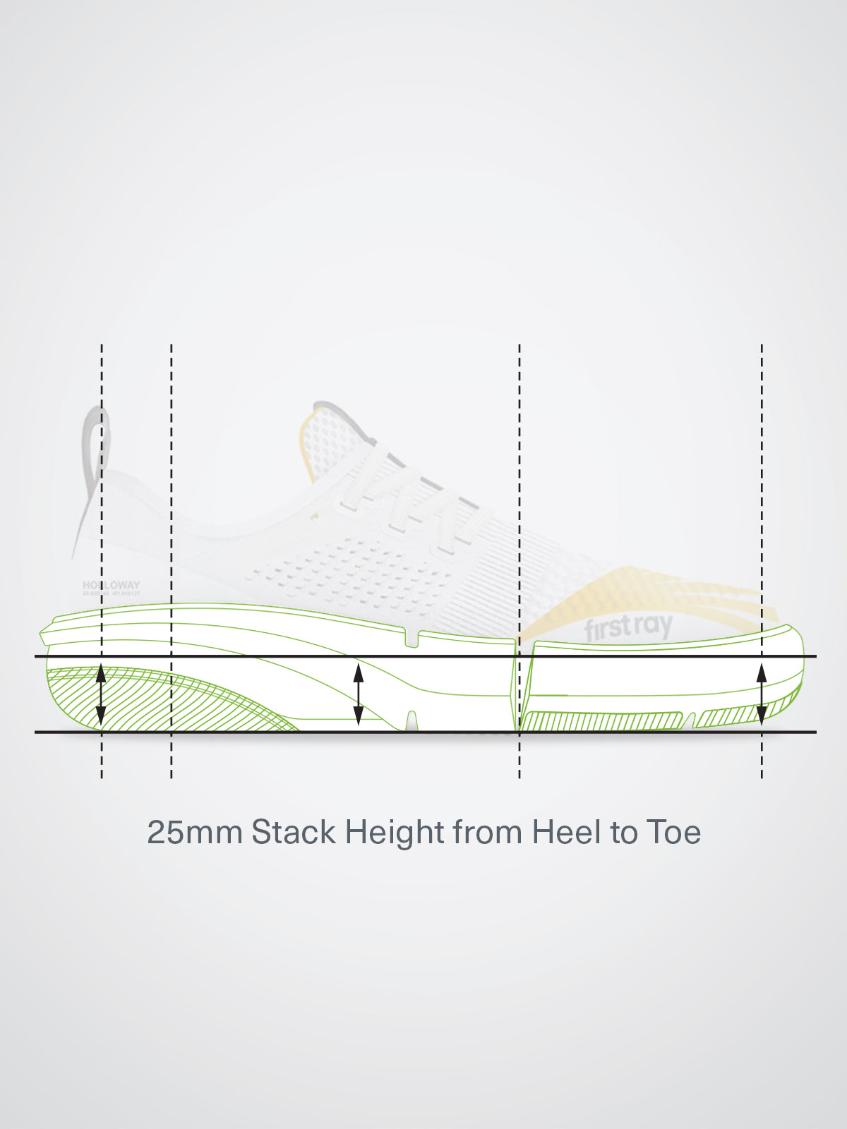 Our True ZERO-DROP footbed maintains a consistent 25mm stack height from heel to tips of toes - not just to the ball of the foot, like most "zero-drop" shoes.